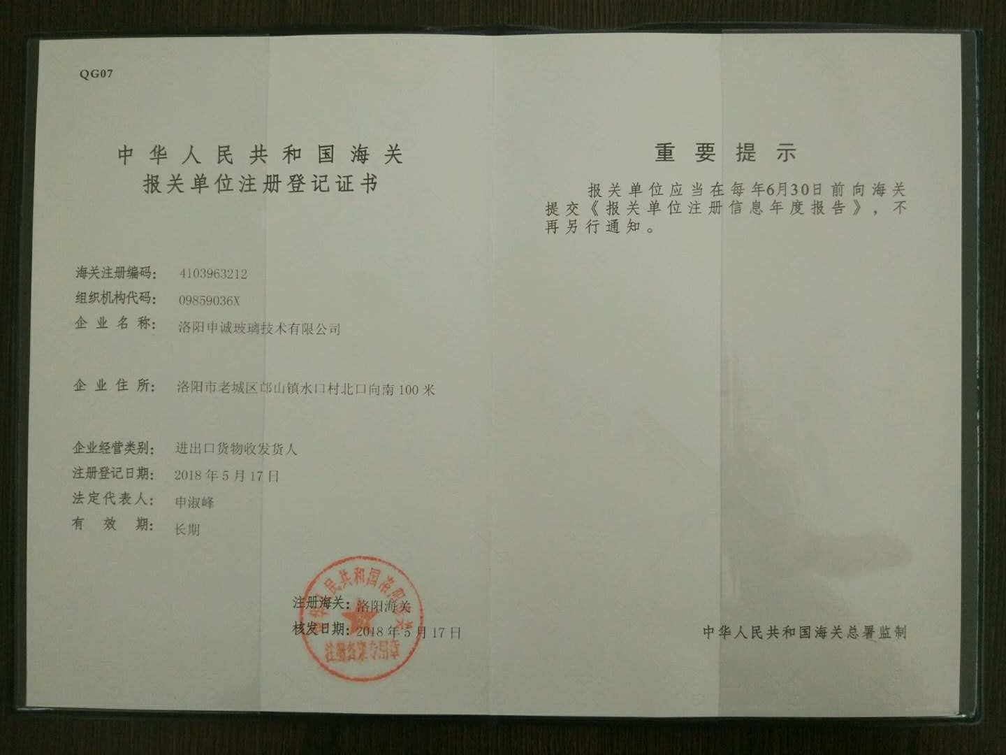 中華人民共和海關(guān)報關(guān)單位注冊登記證書(內(nèi)頁)